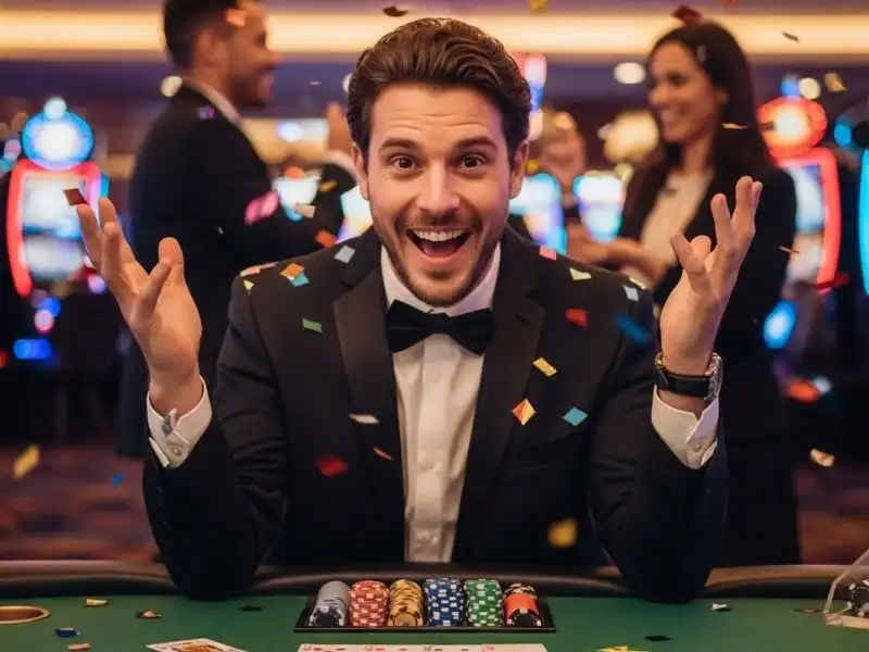 Joyful casino player holding chips representing casino cash in 50 pesos gameplay